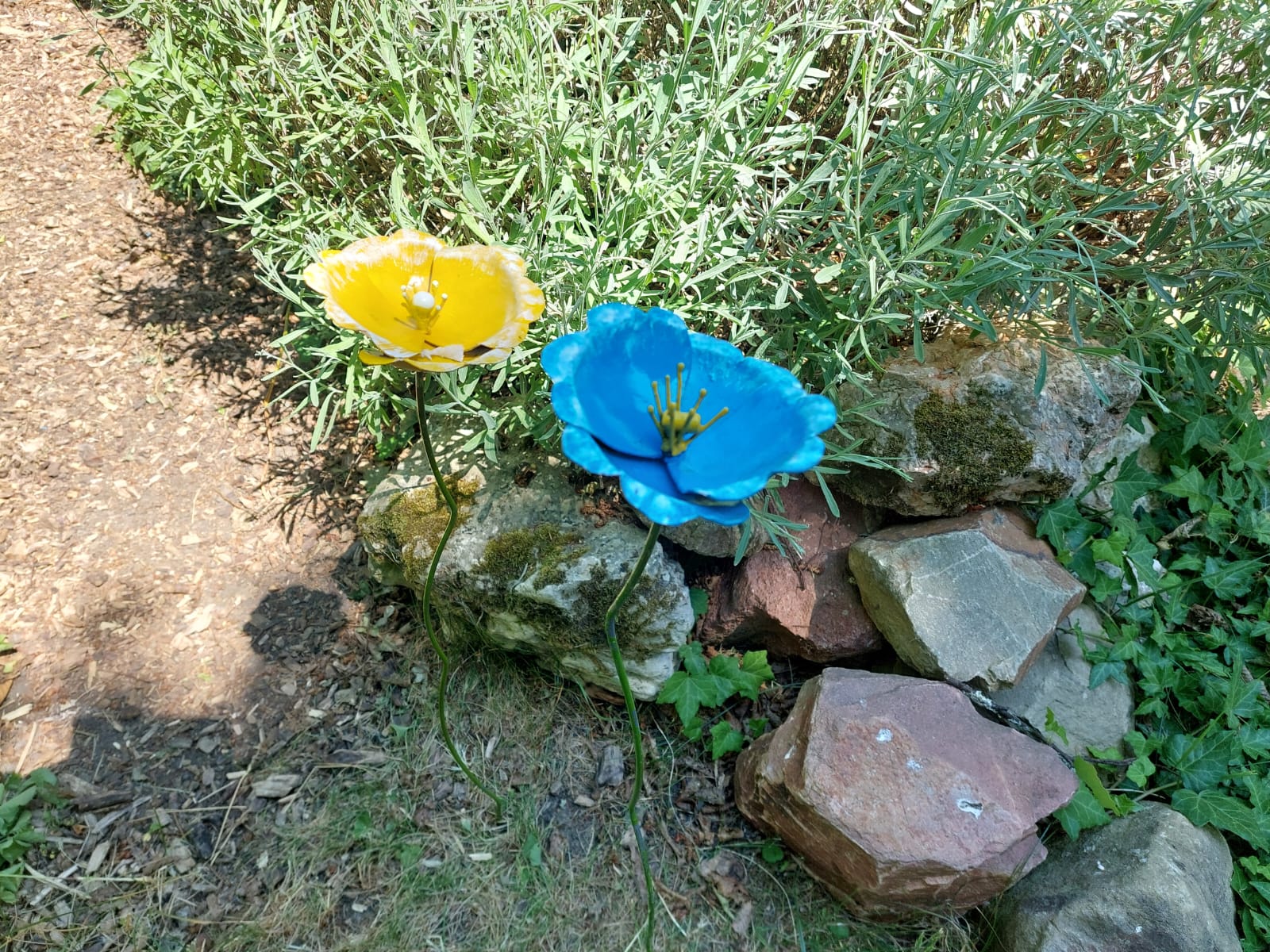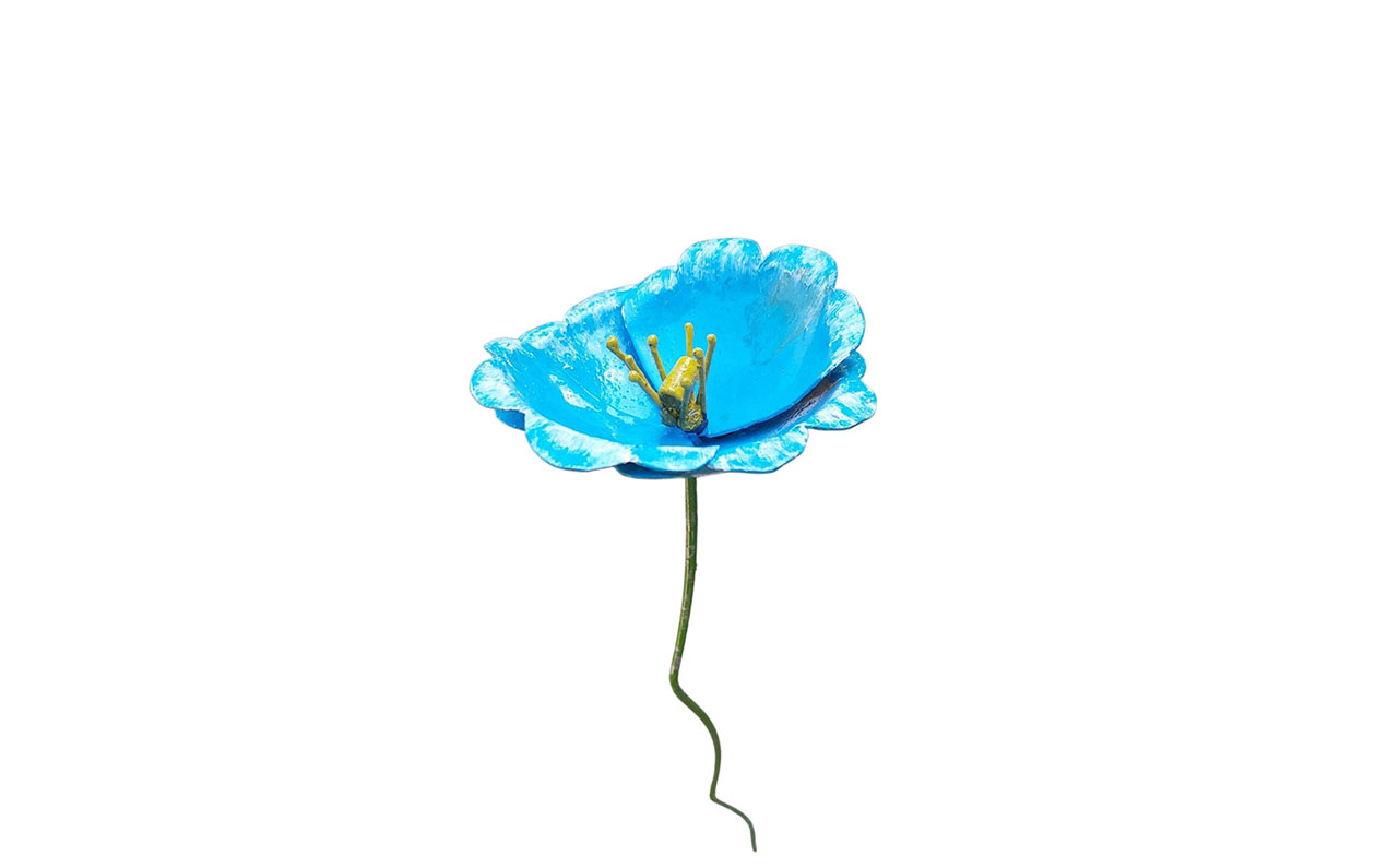 Deze klaproos grafdecoratie van metaal is gemaakt in Zimbabwe door het lokale bedrijf Zimba-Arts. Dit bedrijf geeft oud ijzer een nieuwe functie in metal-art kunstwerken.