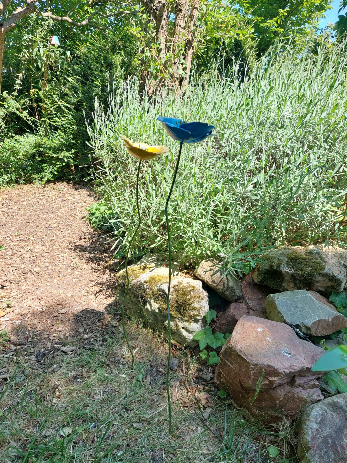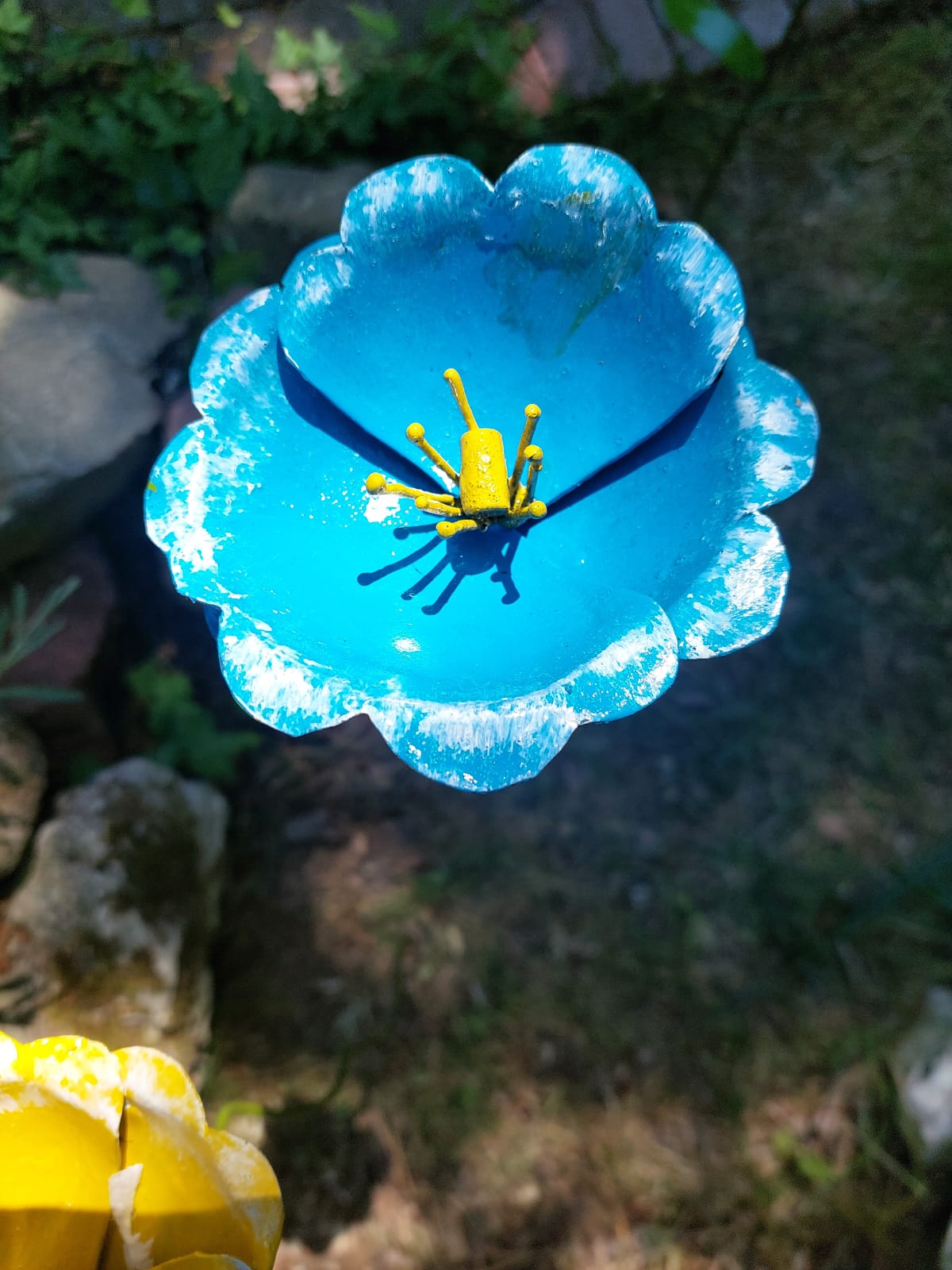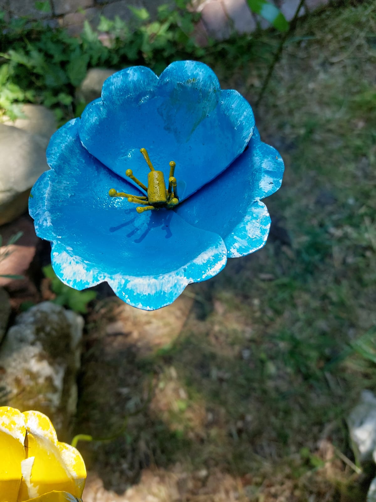 Over de maker van de tuinsteker grafdecoratie blauwe bloem