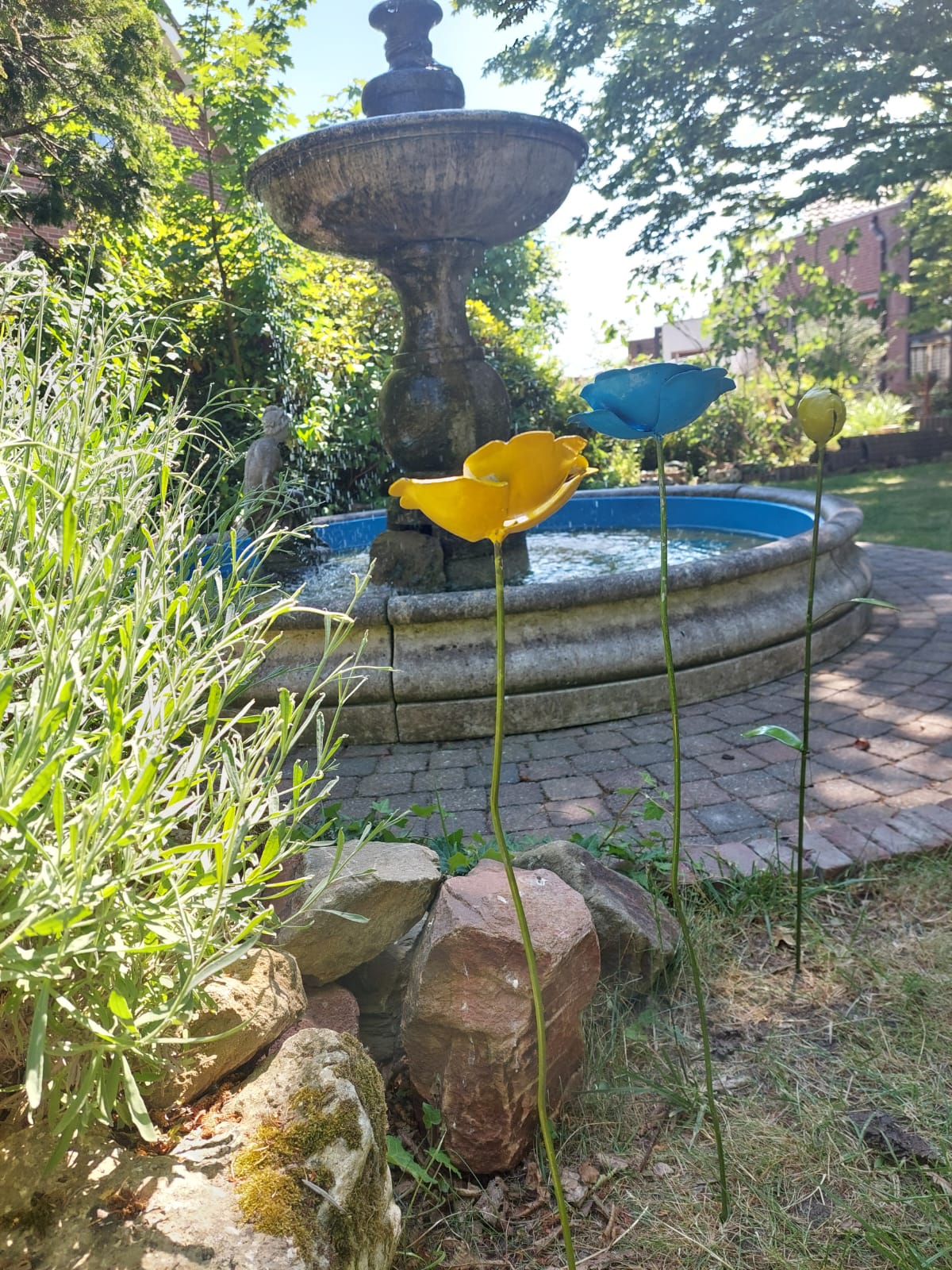De diameter van de bloem is ongeveer 11 cm. De stanghoogte van de metalen bloem is ongeveer 70 cm.