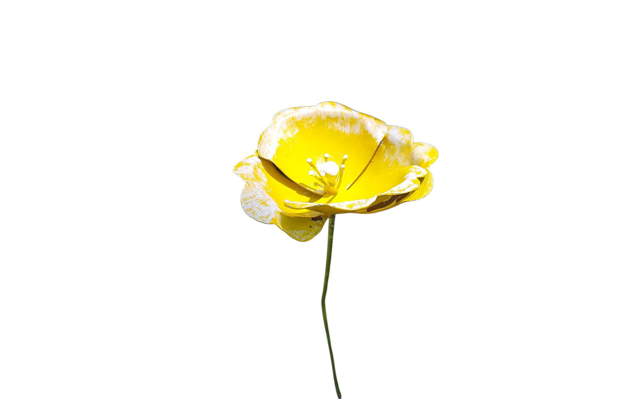 Deze klaproos grafdecoratie van metaal is gemaakt in Zimbabwe door het lokale bedrijf Zimba-Arts. Dit bedrijf geeft oud ijzer een nieuwe functie in metal-art kunstwerken.