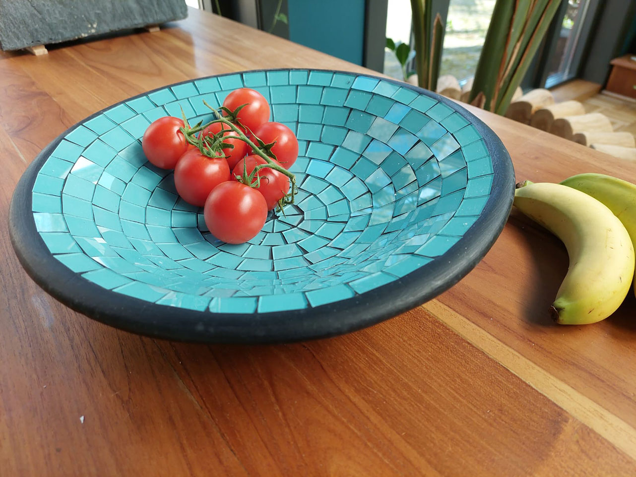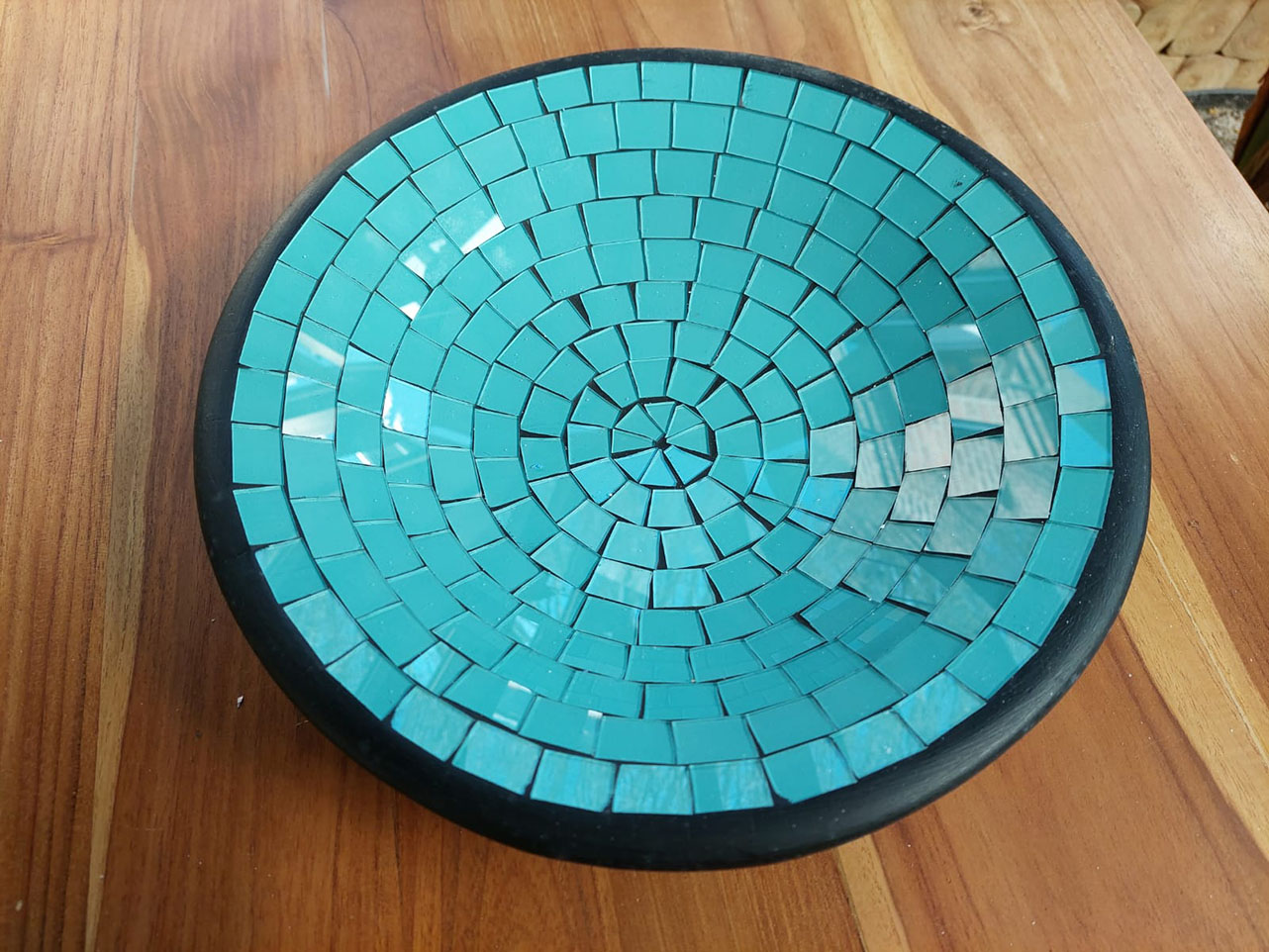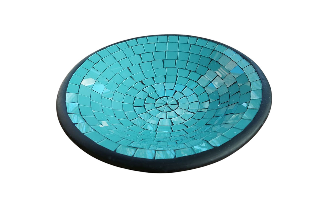 Het aardewerk in de schaal is met zorg ingelegd met glasmozaïek.