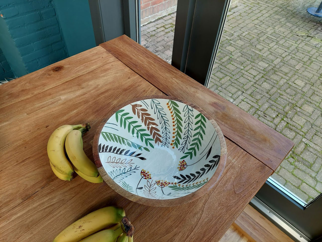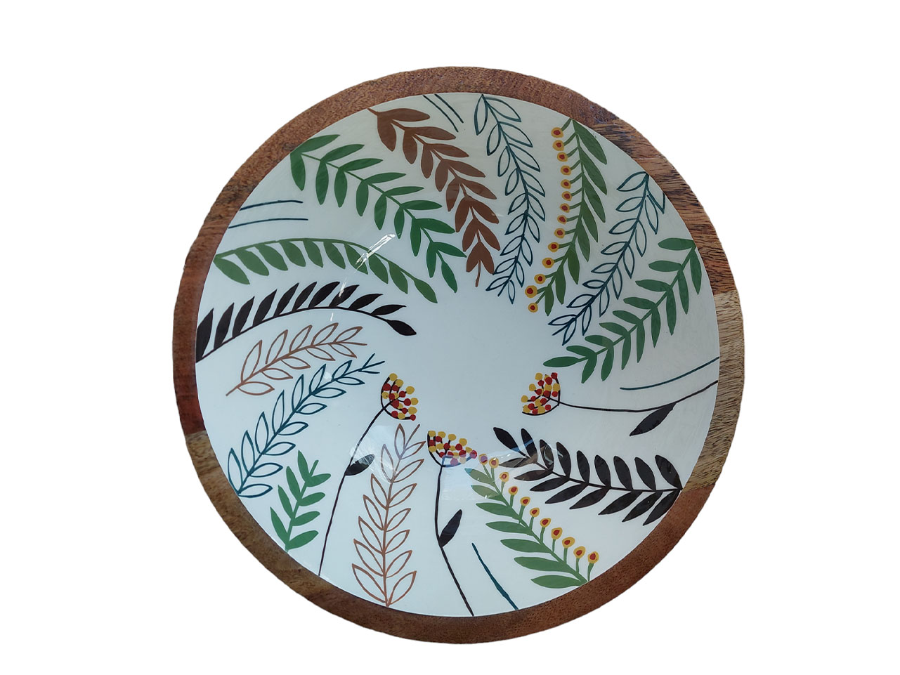 Deze ruime fruitschaal met print gebruik je als fruitschaal of serveerschaal voor een frisse salade. De print uit de natuur in aardekleuren combineert goed met het hout.