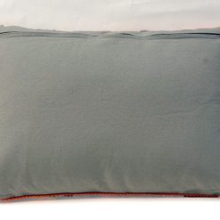 Achterzijde van het kussen is bruingrijs. Een mooi detail is de afgewerkte rand van kleine balletjes.