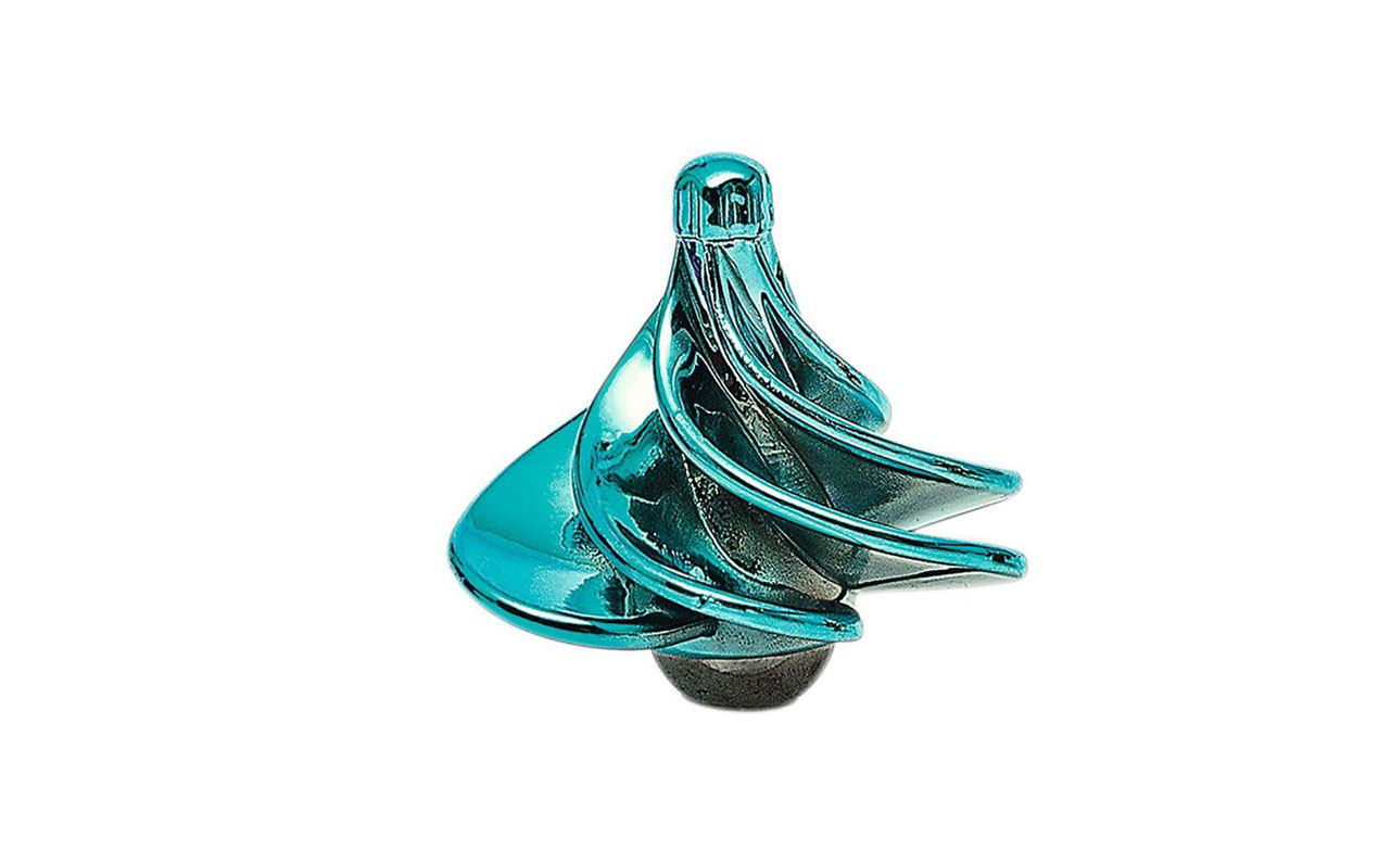 De tol is gemaakt van glimmend metaal in een vrolijke kleur.