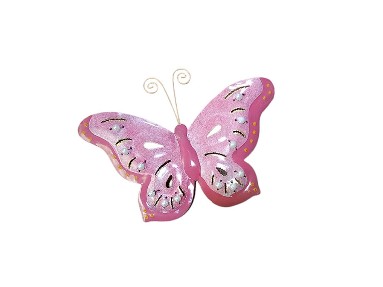 De vlinder is gemaakt van gerecycled metaal en met de hand beschilderd in natuurlijke kleuren. Je ziet dat er aandacht aan is besteed. Mooi detail zijn de kralen die als parels op de vleugels pronken.