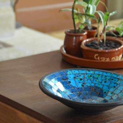 Het glasmozaïek op de schaal is ingelegd in de kleurstelling blauw met een mix van geel en oranje details.