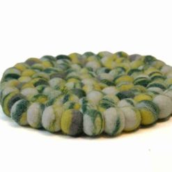 De onderzetter bestaat uit verschillende bolletjes vilt in verschillende kleuren. In de kleurstelling groen, geel en wit. Het mooie aan deze onderzetter is dat deze niet bestaat uit egaal gekleurde bolletjes. Elk bolletje is een mix van deze kleuren.