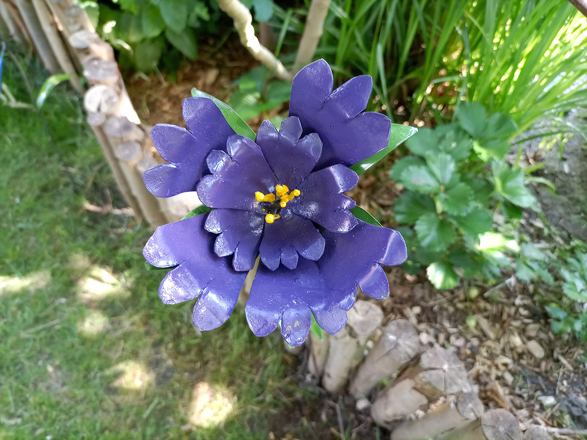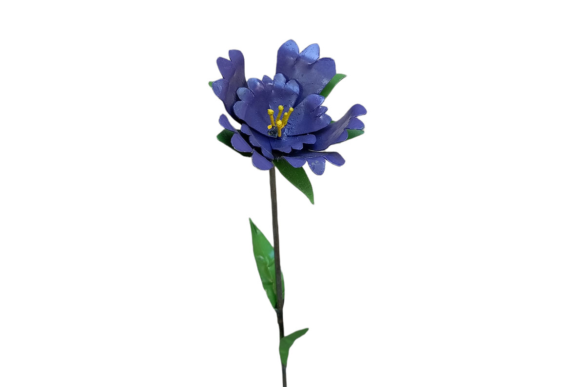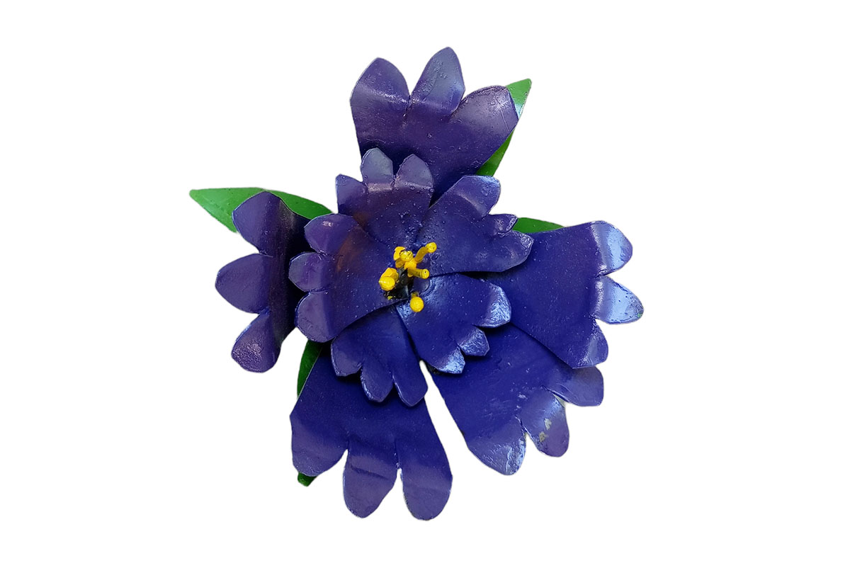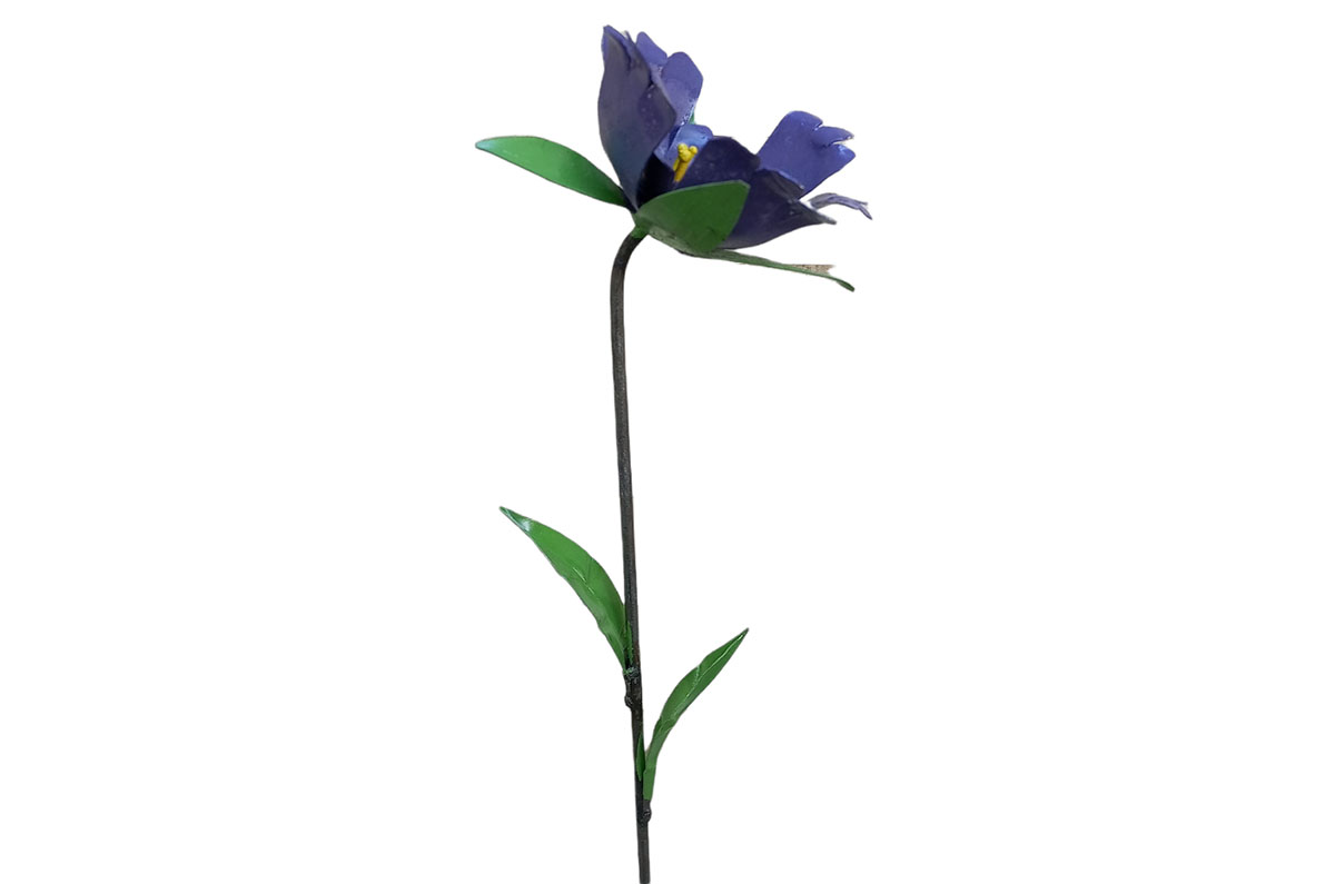 Deze tuinsteker van een bloem is gemaakt in Zimbabwe door het lokale bedrijf Zimba-Arts. Dit bedrijf geeft oud ijzer een nieuwe functie in metal-art kunstwerken. Deze werknemers kunnen zo in hun levensbehoefte voorzien.