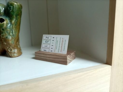De houten visitekaartjeshouder is gemaakt van restmateriaal uit een meubelmakerij. Hout dat gebruikt wordt in de meubelmakerij moet van goede kwaliteit voldoen. Dat is te zien in deze houders. Het hout wat overblijft van de meubelmaker en te klein is om nog wat mee te kunnen doen, wordt normaal gesproken verbrand. Dit hout wordt gered en gebruikt voor degelijke producten die lang meegaan.
