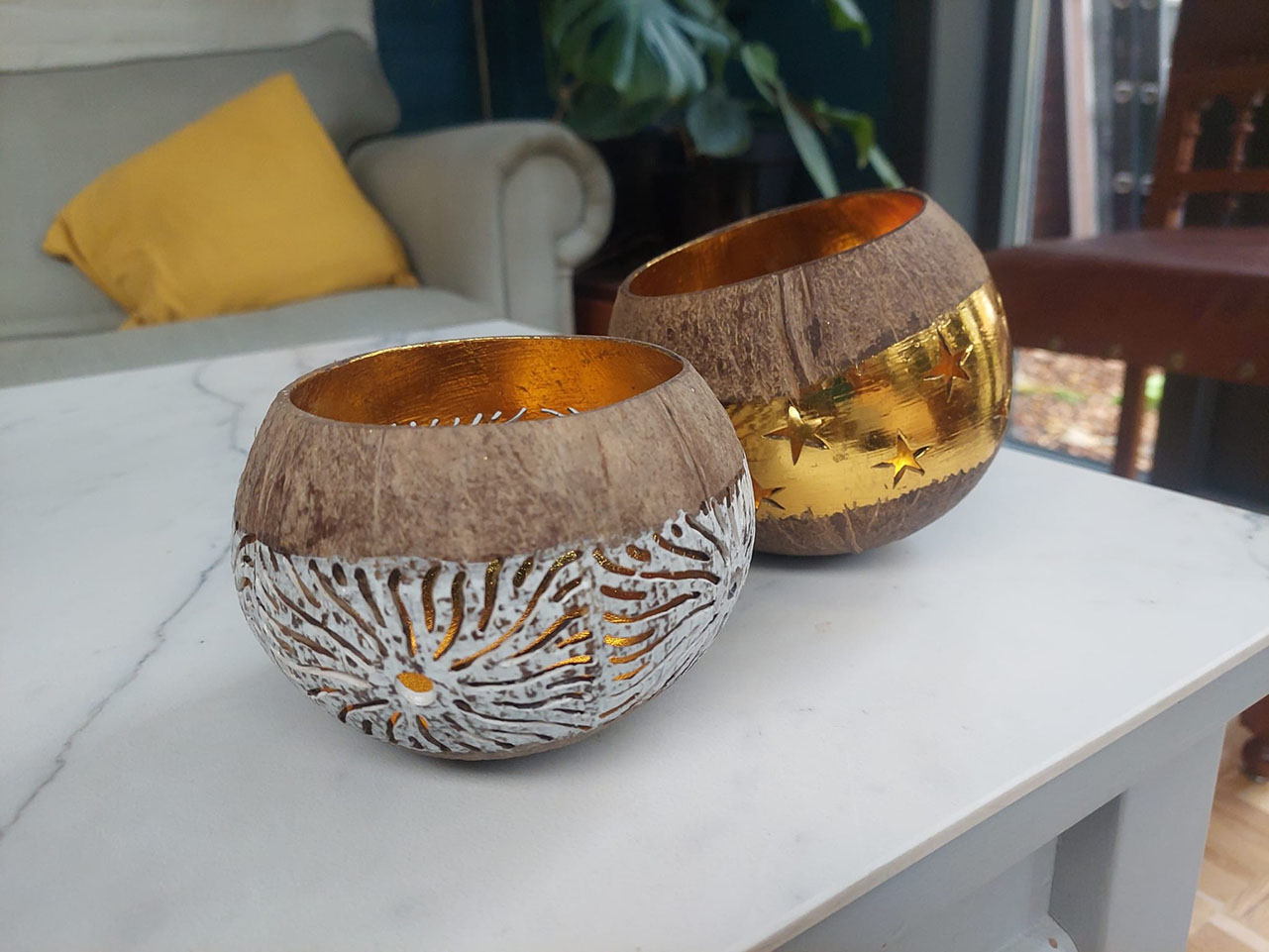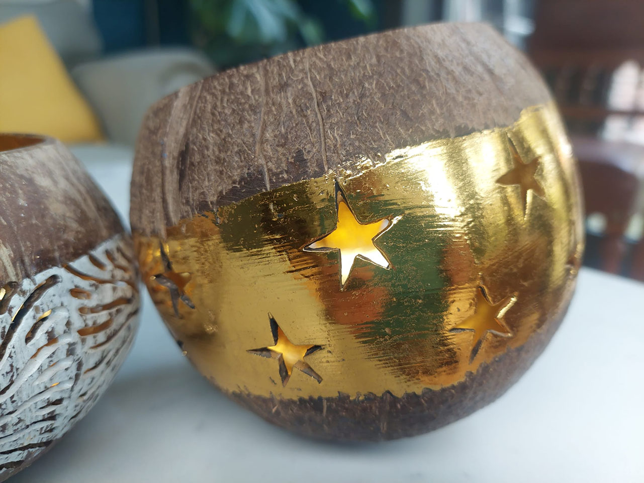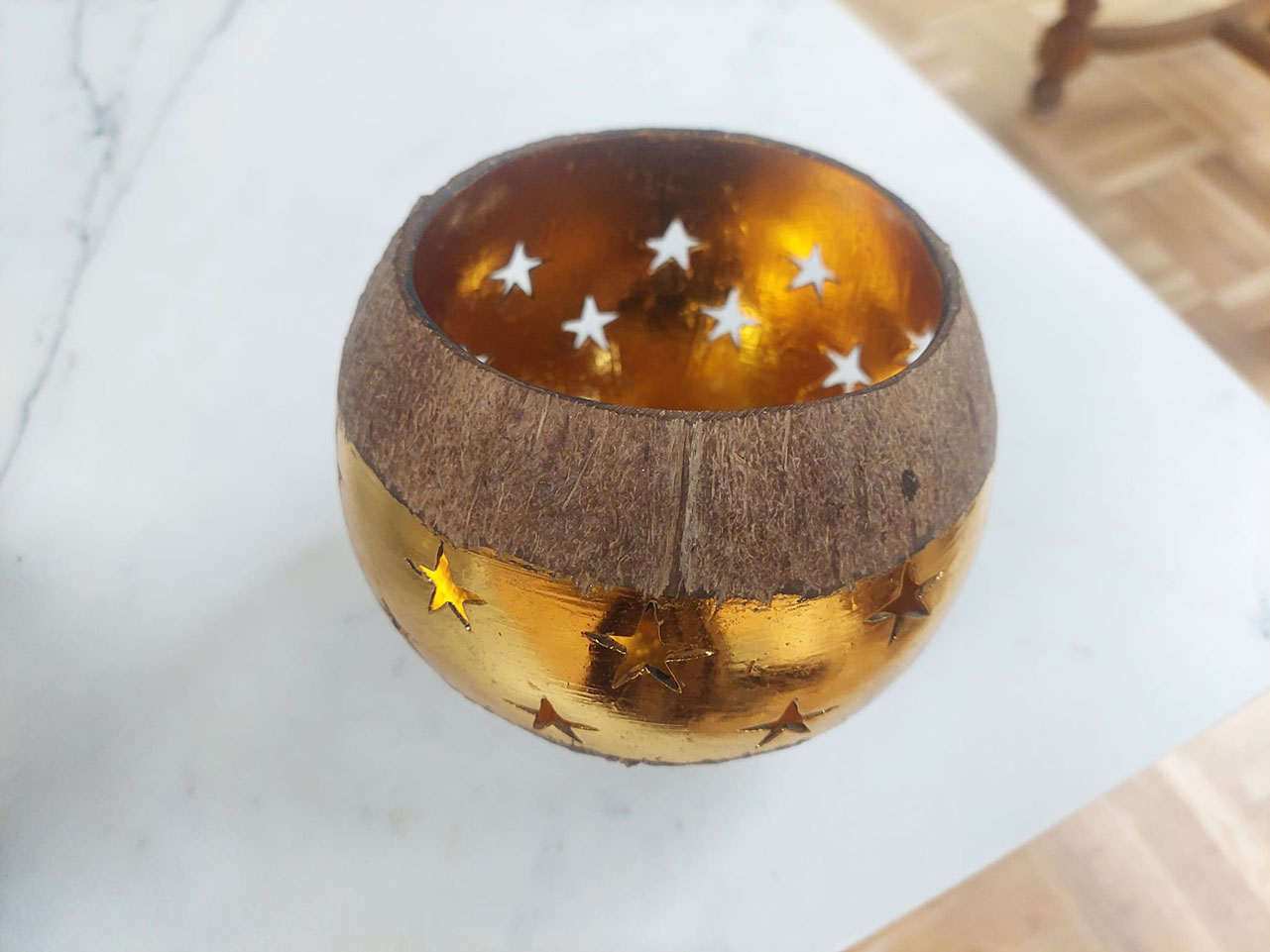 Deze waxinelichthouder geeft licht zonder kaars. Yep, het goud in de kokosnootschaal vangt het licht op uit de ruimte en dit weerkaatst. Omdat de binnenzijde rond is, versterkt het elkaar. Deze geeft dus licht zonder kaars te branden!