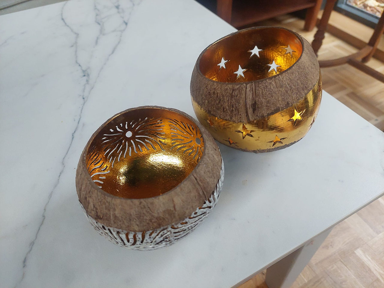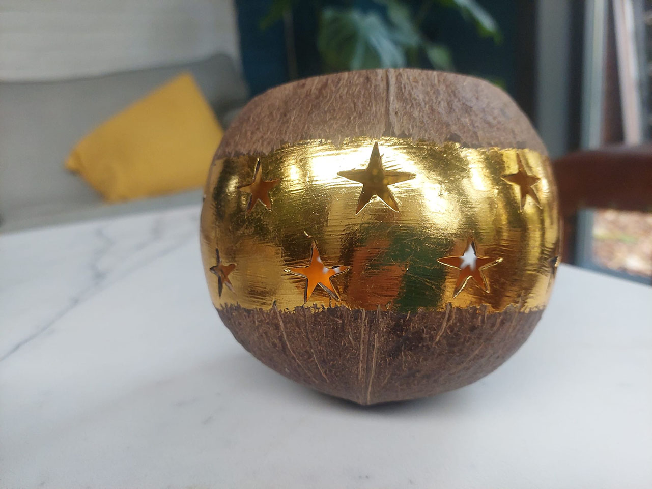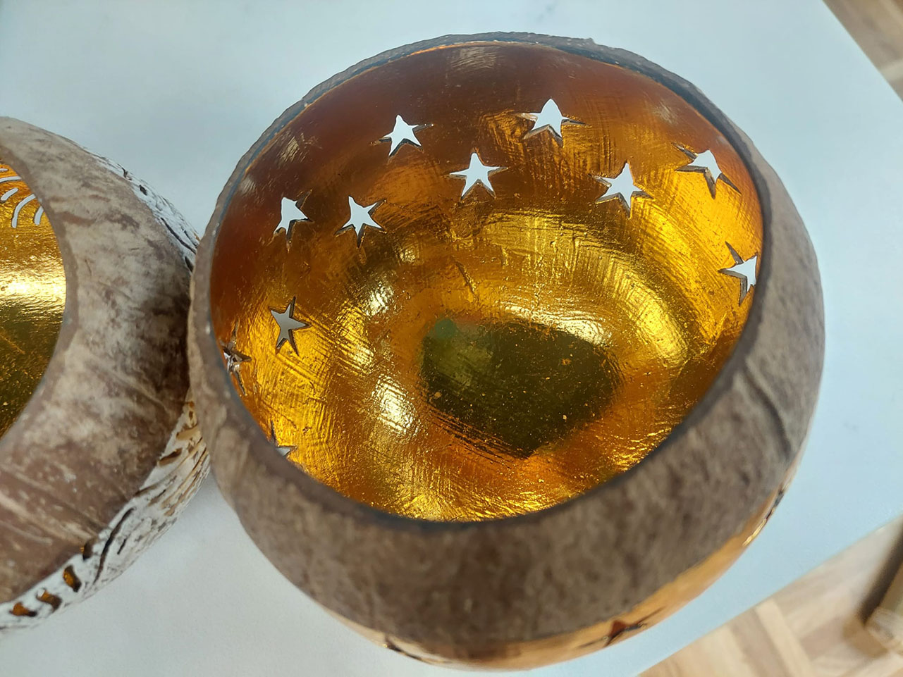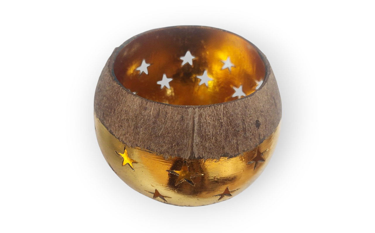 Deze waxinelichthouder geeft licht zonder kaars. Yep, het goud in de kokosnootschaal vangt het licht op uit de ruimte en dit weerkaatst. Omdat de binnenzijde rond is, versterkt het elkaar. Deze geeft dus licht zonder kaars te branden!