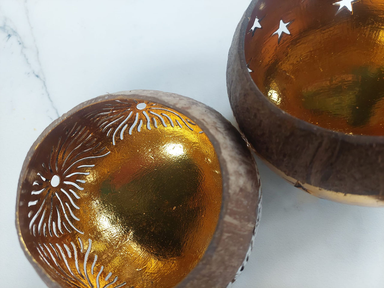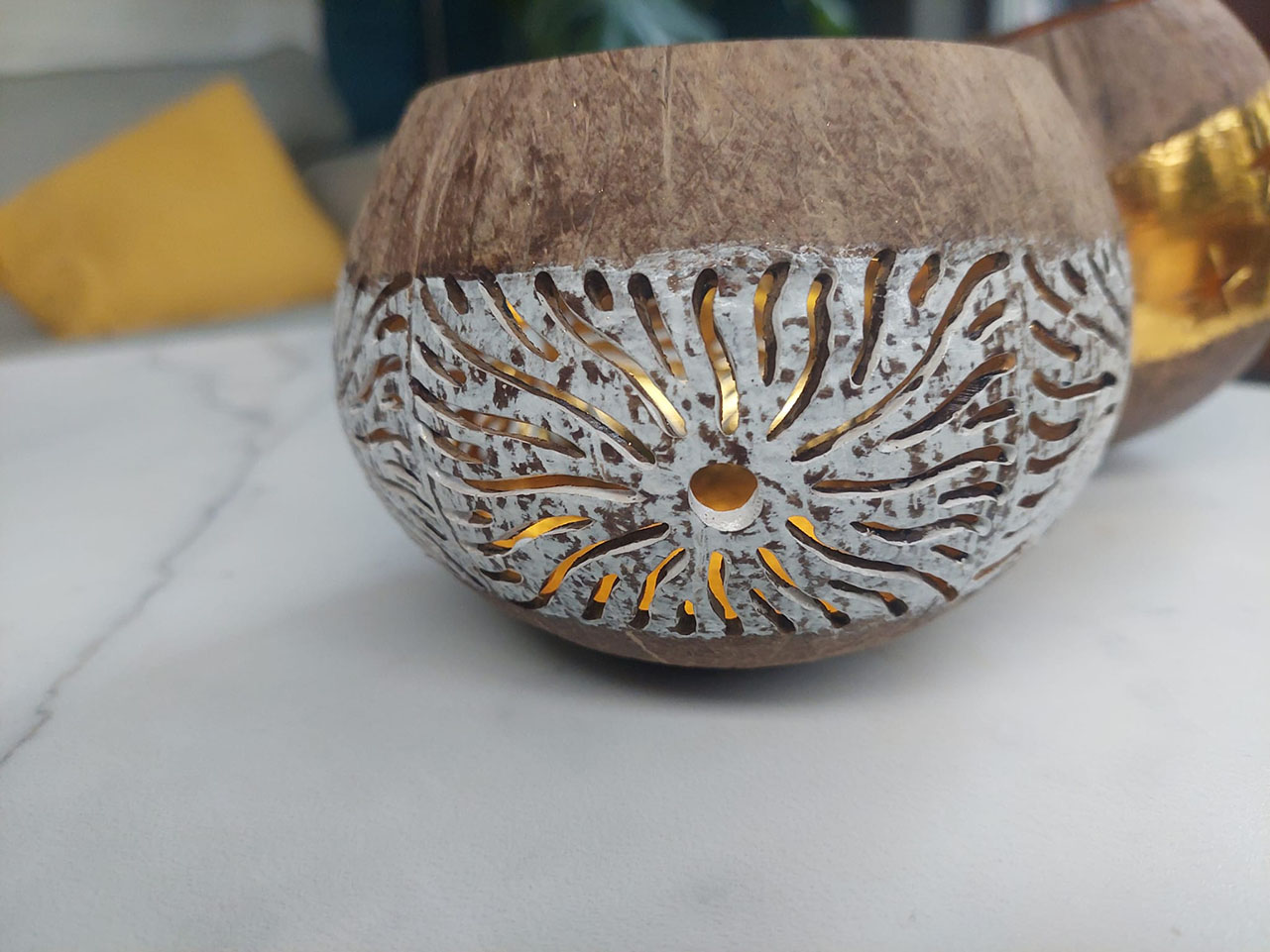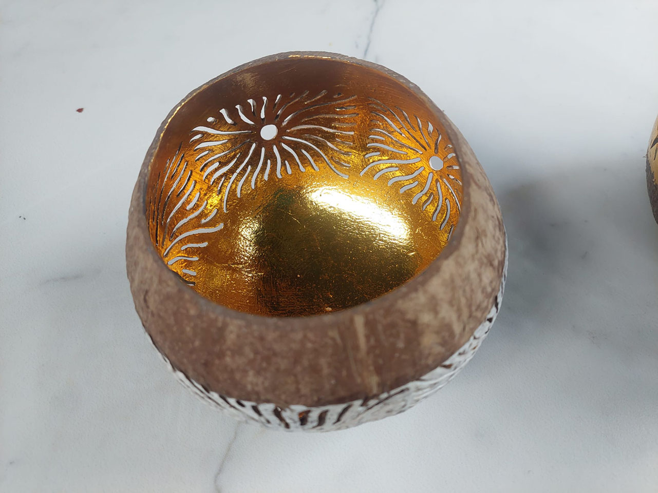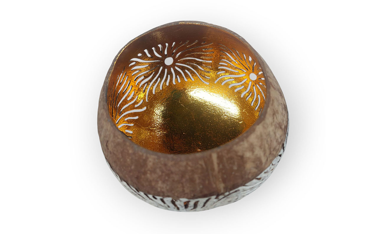 WAXINELICHTHOUDER KOKOSNOOT GOUD zon